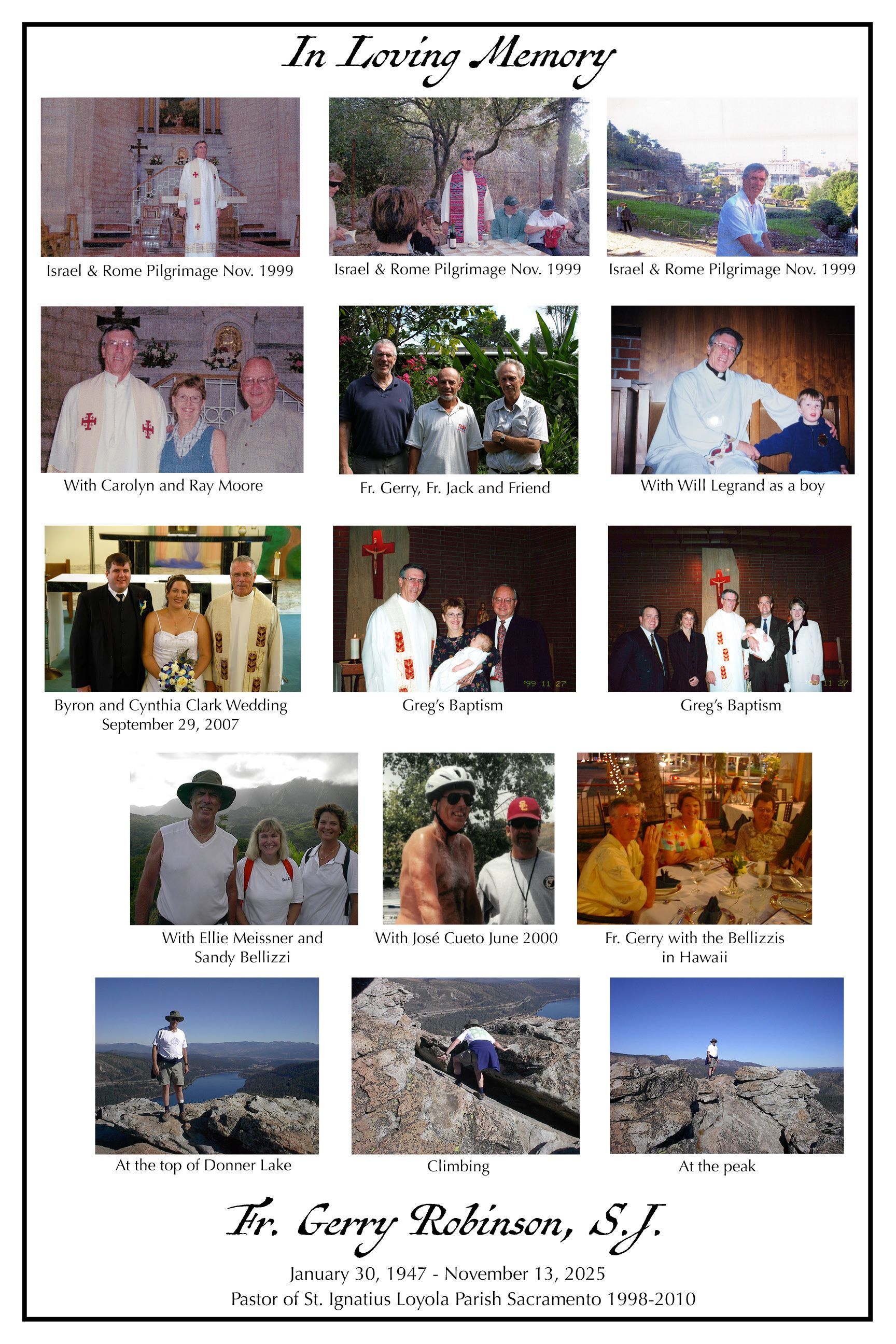 Fr. Gerald H. Robinson, S.J., passed away suddenly, but not unexpectedly after a period of declining health, at a medical appointment in San Jose, CA on Thursday, November 13, 2025. Gerry was born in San Francisco, CA on January 30, 1947, entered the Society on September 7, 1965 in Los Gatos, CA and was ordained May 21, 1977 in San Francisco at his home parish. He professed his final vows on August 27, 1990 in Santa Clara. He was 78 years old and a Jesuit for 60 years.