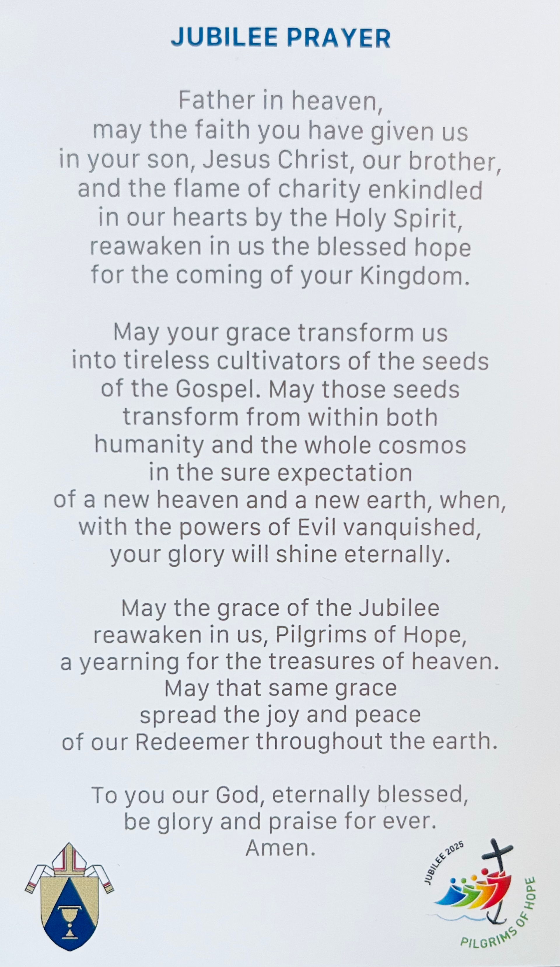 In our Diocese, we will celebrate a special Vigil mass to proclaim the Jubilee Year at the Cathedral on Saturday, December 28, 2024 (The Feast of the Holy Family). The Holy Doors in Rome will close on December 28, 2025 and the Jubilee will formally conclude in Rome on January 6, 2026 (The Solemnity